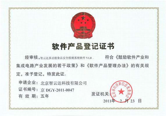 软件产品登记证书——智云达多功能食品安全检测系统软件V1.0
